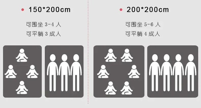 2.0*1.5可围坐3-4人,平躺3个成人左右;