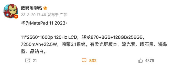 据数码闲聊站爆料,华为MatePad 11 2023主要配置有:11英寸2560*1600分辨率120Hz刷新率LCD屏,搭载骁龙870处理器,提供8+128/256GB版本,7250mAh电池、22.5W充电,鸿蒙3.1系统,有柔光屏版本,提供流光紫、曜石黑、海岛蓝、晶钻白4个配色。