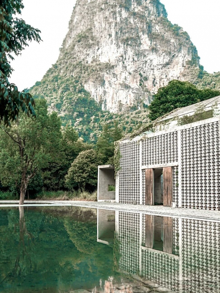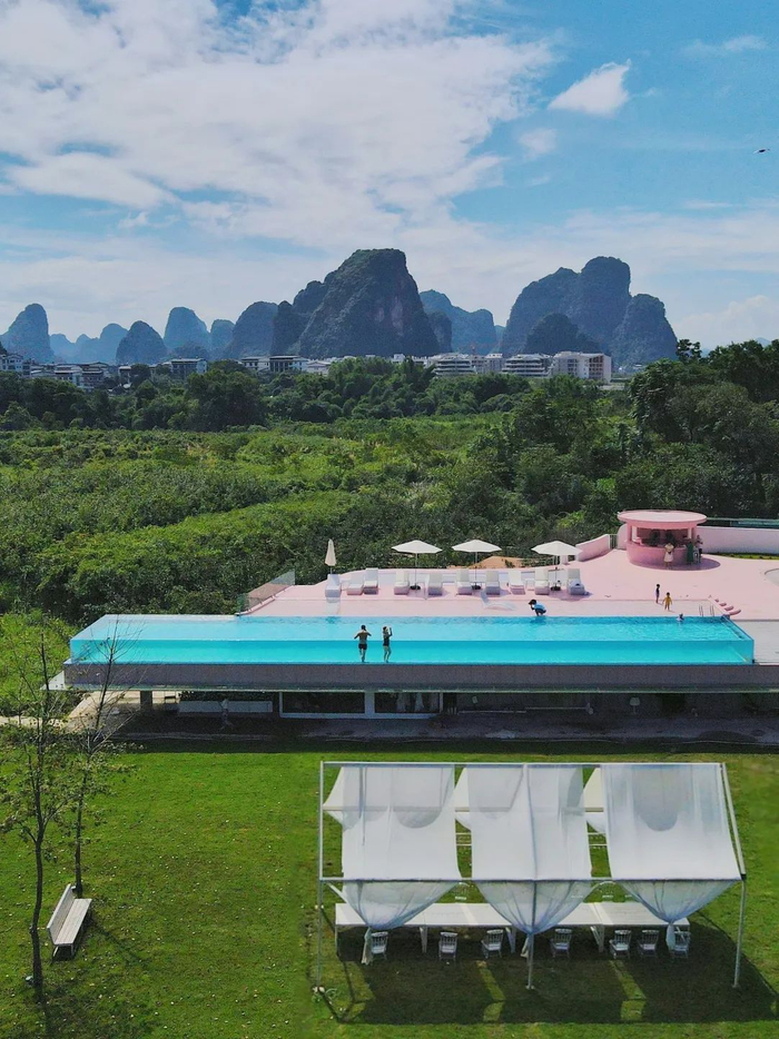 以残缺的历史工业遗址映衬出无边泳池与漓江浑然天成的沁心之美,泳池背靠漓江之畔的连绵山峦,清丽秀美。