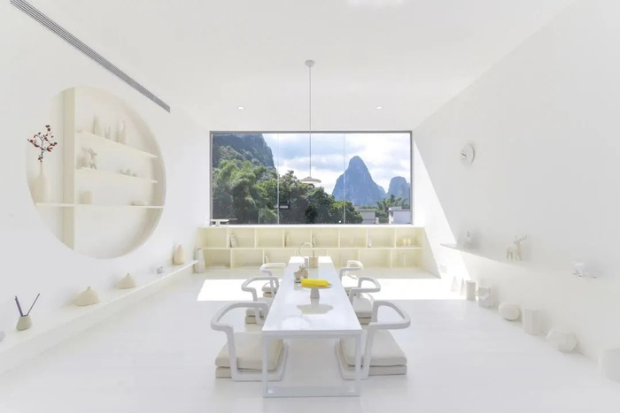 它巧妙的大范围运用落地窗,让房间尽可能地利用采光,最大化地保留阳朔山水的美景,形成了绝佳的窗景。