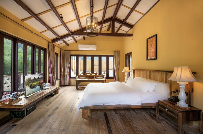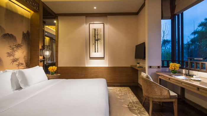 部分房间还拥有270度超大视角阳台,将晨辉晚霞、蛙声鸟鸣、翠竹白鹭全部尽收眼底。
