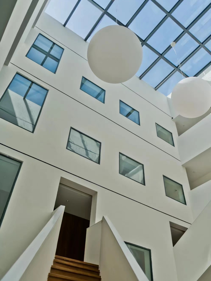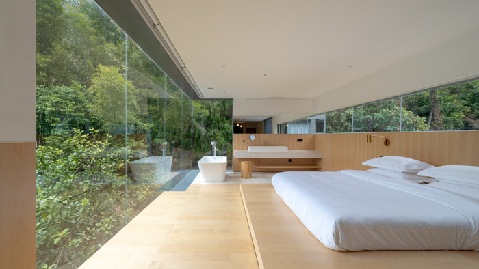 虽是一幢极具设计感的现代建筑,但坐落在山间并不突兀违和,与窗外的山水风光和谐相融,反倒颇有一种自然美学之感。