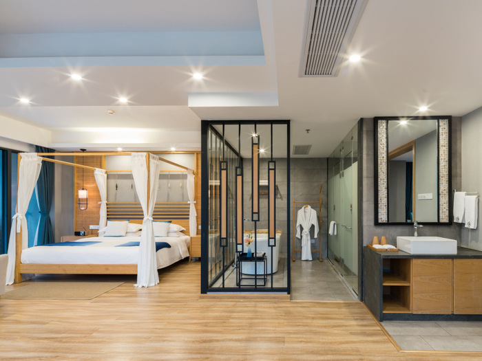 厅内设有窗边浴缸,可以近观绿水山峦,幸运地话还可以看到对面大榕树景区热气球升起。