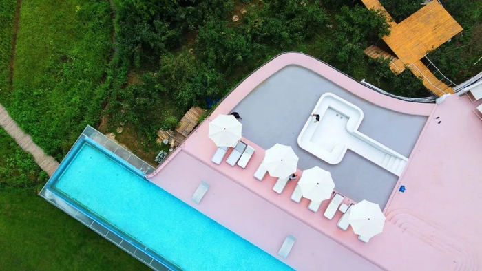 良宿·奢网红旅拍酒店位于风景如画的遇龙河国家级旅游度假区内,巧妙运用马卡龙色彩塑造不同空间感,在青山绿水间显得格外亮眼。