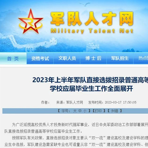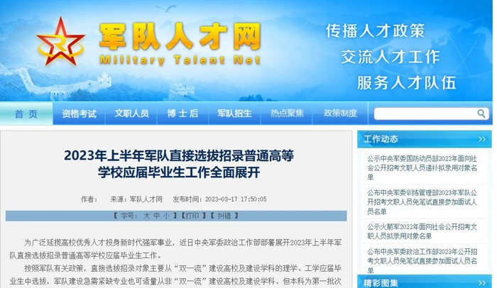 为广泛延揽高校优秀人才投身新时代强军事业,近日中央军委政治工作部部署展开2023年上半年军队直接选拔招录普通高等学校应届毕业生工作。今年计划提供3500余个军(警)官岗位公开招录。