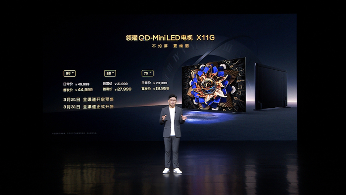 TCL 领曜QD-Mini LED X11G于3月21日开启全网预售,3月31日正式开售。共有98吋、85吋和75吋三个尺寸:98吋新品首发价44999元,85吋新品首发价27999元,75吋新品首发价19999元。