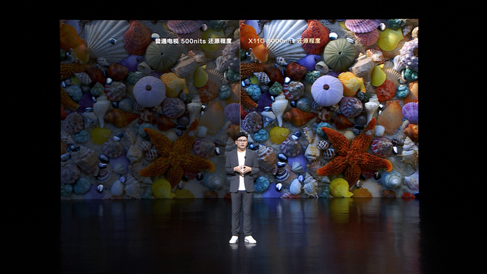 芯片方面,将上一代领曜芯片M1升级到了M2,还增加了一颗独立的TXR Mini LED 画质增强芯片,实现像素级画质调校,突破典藏级影像体验。除了这两颗芯片外,为了发挥双5000的效果,X11G还搭载了1296颗背光驱动芯片,它具备双向16bit控制能力,可以实现16bit的亮度调节和16bit的灰度调节,带来了更好的观赏体验。