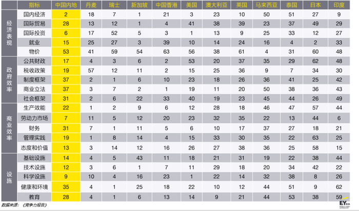 中国在市场规模、产业链和供应链及劳动力市场等方面的优势,使得其对外国投资者在近年来保持着较高的吸引力。《竞争力报告》显示,在63个经济体中,中国内地综合排名位列17。评价标准包括经济表现、政府效率、商业效率和设施四大综合指标,以及项下细分指标等,中国内地的经济表现排名靠前(第4),政府效率排名略为靠后(第29),商业效率和设施分别位列第15和21。
