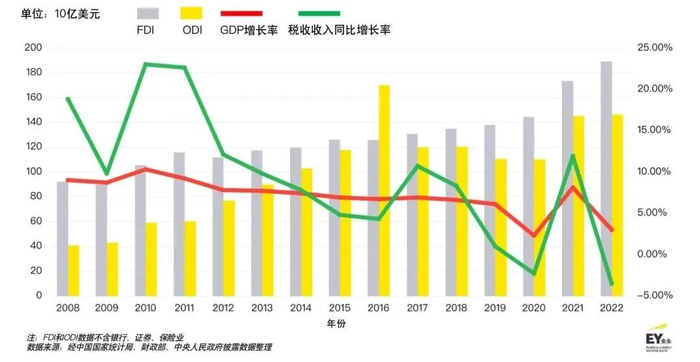 中国GDP、FDI、对外直接投资(ODI)的年增长率以及税收收入同比增长率(2008-2022)