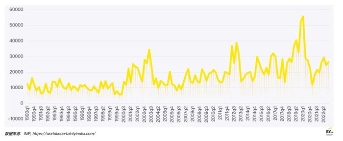 国际货币基金组织(IMF)发布的《地缘经济分裂与多边主义的未来》2显示,在经历了几十年的全球经济一体化之后,世界正面临政策驱动的地缘经济碎片化风险。受疫情和复杂的国际形势等因素影响,全球经济发展面临不确定性,世界不确定性指数在近年的波动中也触及高位。