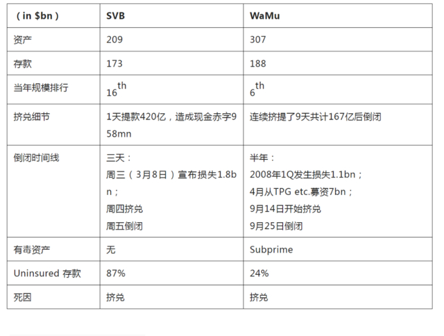我把SVB这个史上第二大倒闭案,和史上第一大:Washington Mutual (西雅图WaMu)倒闭案对比了一下:
