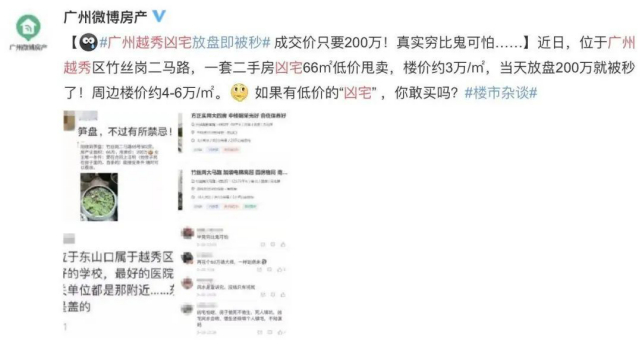 广州越秀区,一套66平方的房子,因为曾有人自杀,低于市场价1万一平出售,买家甚多,刚出价就被秒。