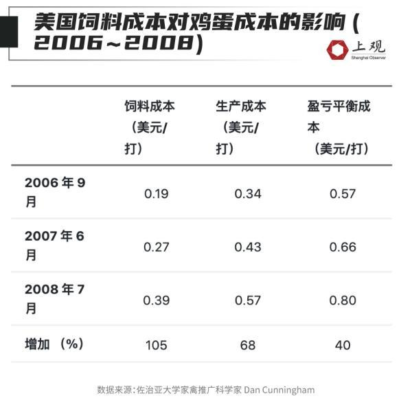 在 2006 年 9 月到 2008 年 7 月,美国曾经经历过一轮玉米等作物的价格上涨。家禽专家研究发现,在那一时期饲料原料成本涨价105%的情况下,鸡蛋的生产成本和盈亏平衡成本分别上涨68%和40%。