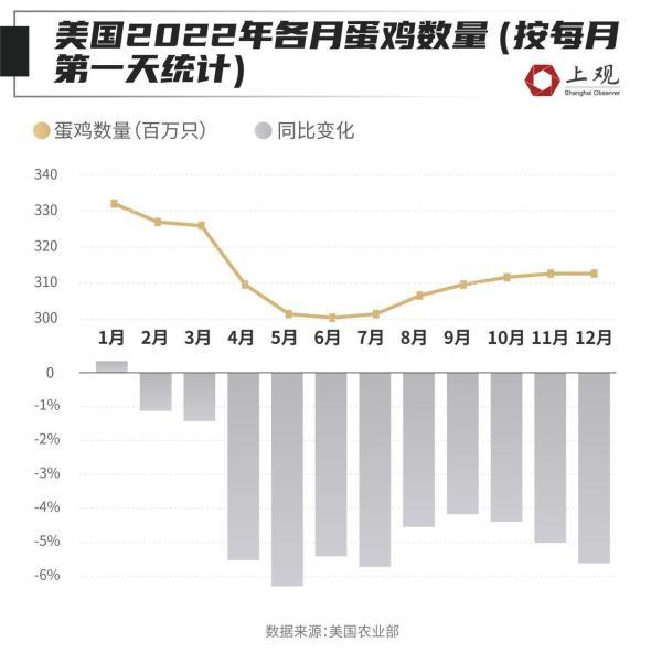 农业部数据显示,美国的蛋鸡数量自2022年2月-12月连续下滑,同比下降幅度最高达到6%。12 月的蛋鸡数量与去年同期相比减少了约 5.8%,如果按照2014-2015年蛋鸡数对价格上涨的影响进行估计,仅是12月蛋鸡数量的下滑,可能就对鸡蛋价格的上涨贡献了35%-47%。