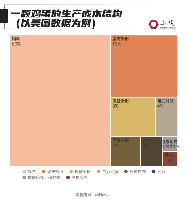 不同国家和地区的养殖系统存在差异,但大致上都会包括玉米、大豆等饲料成本、雏鸡/鸡苗摊销成本、保持适宜温度的取暖用电成本和人力成本,这几部分占到成本的90%。尤其是饲料成本占到大头。在美国,饲料成本占到鸡蛋生产成本的60%左右。