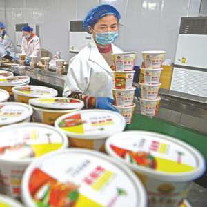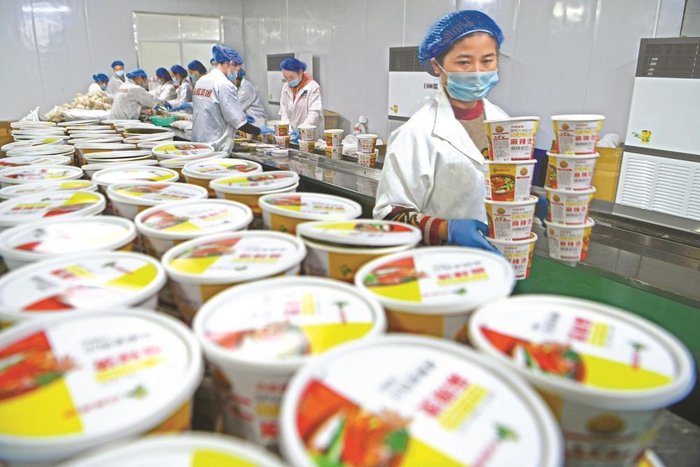 自2012年以来,淮南白蓝集团研发了袋装、桶装的淮南牛肉汤、麻辣烫等20多种方便食品,将地方特色小吃转化成速食方便产品,借助电商平台,实现产销两旺。(资料图片)