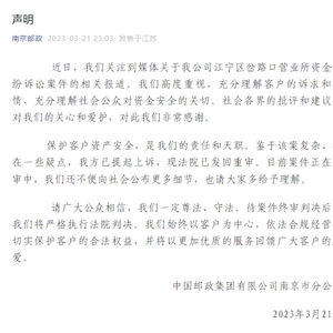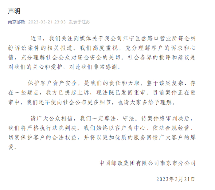 针对此事,中国邮政集团有限公司南京市分公司3月21日发布声明回应:“近日,我们关注到媒体关于我公司江宁区岔路口营业所资金纠纷诉讼案件的相关报道。我们高度重视,充分理解客户的诉求和心情,充分理解社会公众对资金安全的关切。保护客户资产安全,是我们的责任和天职。鉴于该案复杂、存在一些疑点,我方已提起上诉,现法院已发回重审。目前案件正在重审中,我们还不便向社会公布更多细节,也请大家多给予理解。