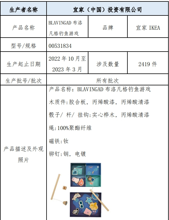 “上海市场监管”微信号22日发布消息称,宜家(中国)投资有限公司2023年3月21日至2023年6月20日召回2022年10月至2023年3月生产的“BLAVINGAD布洛凡格钓鱼游戏”玩具,涉及2419件。