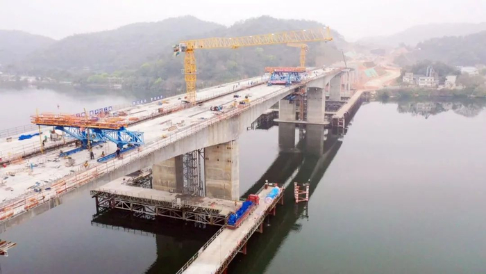 凤凰大桥跨省道227线现浇梁部分,施工人员正进行左幅挂篮施工,右幅的挂篮施工已经完成,而项目文祠截洪渠大桥桥面系湿接缝混凝土浇筑施工也在同步开展。