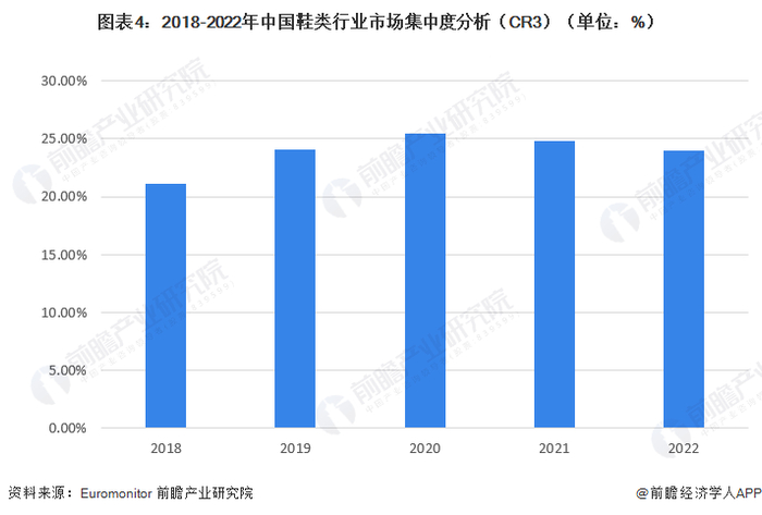 根据Euromonitor披露的数据显示,2018-2022年中国鞋类行业CR3整体呈现增长的趋势,2022年中国鞋类行业CR3为24%,中国鞋类行业市场集中度较低,行业内竞争较激烈。