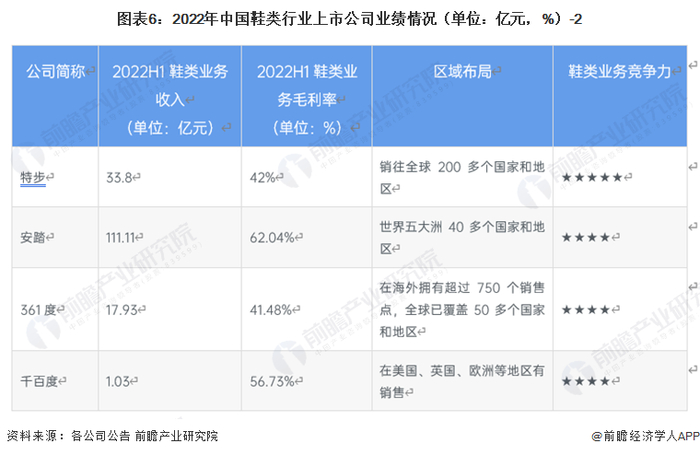 2022年上半年,安踏与李宁鞋类业务收入较高,安踏鞋类业务收入111.11亿元,李宁鞋类业务收入67.59亿元;从毛利率角度分析,安踏与千百度鞋类业务毛利率较高,安踏为62.04%,千百度为56.73%;从布局区域角度分析,特步、361度与安踏销售区域较广,特步的产品销往全球200多个国家和地区,361度的产品在海外拥有超过750个销售点,全球已覆盖50多个国家和地区,安踏的产品销往世界五大洲40多个国家和地区。