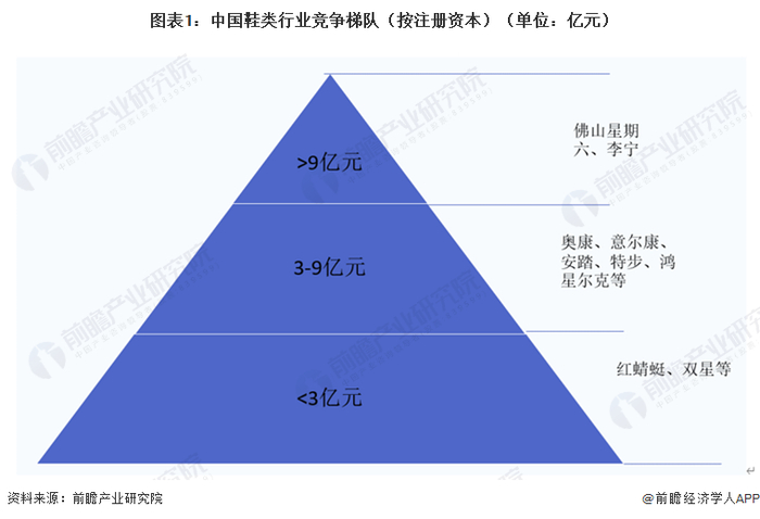 鞋类行业依据企业的注册资本划分,可分为3个竞争梯队。其中,注册资本大于9亿元的企业有佛山星期六与李宁;注册资本在3-9亿元之间的企业有:奥康、意尔康、安踏、特步等;其余企业的注册资本在3亿元以下。