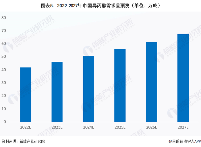从我国异丙醇需求整体规模来看,2020年受新冠疫情以及经济放缓影响,国内异丙醇表观消费量将有所减少,但2021年随着我国经济的逐渐恢复,异丙醇下游行业生产逐渐恢复,对异丙醇的也将有所上升,随着异丙醇不断向新的应用领域的拓展和渗透,前瞻预计,未来异丙醇表现消费量将持续保持增长,到2027年达到67万吨左右。