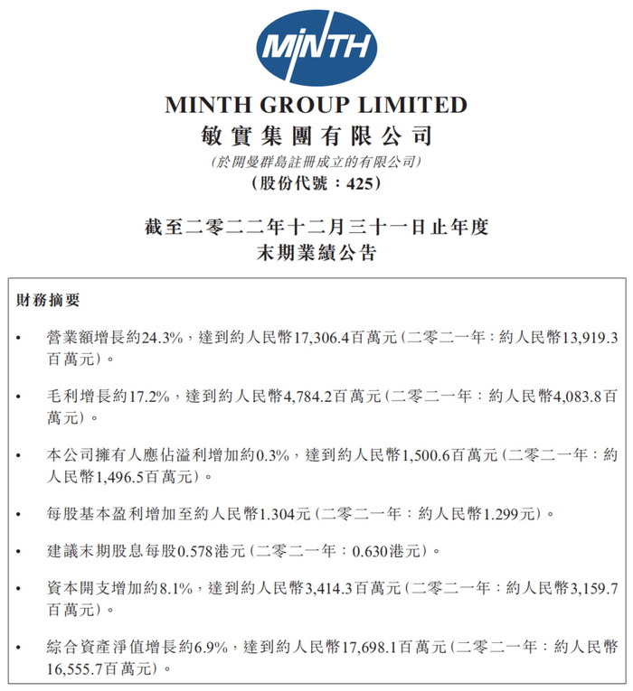 2022年,敏实集团净利润为15.01亿元,同比增长约0.3%,若剔除2021年处置附属公司所产生的一次性收益以及收到土地楼宇等搬迁收益的影响,净利润较2021年增长约40.9%;全年经营活动现金流量净额为约18.55亿元,同比增长40.3%。