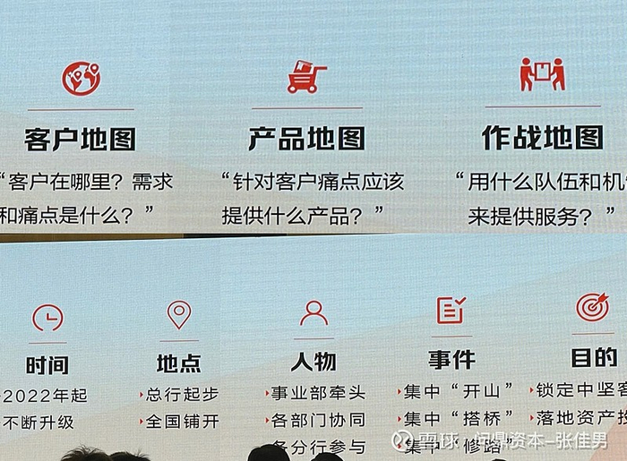 三张地图进分行:三张地图这个打法核心是赋能推动对公业务更有精准有力的发展,推出三张地图战略,主要落地在第二大赛道!上文中讲述的第二大赛道就是全新对公2341战略中提到的“行业化驱动的现代产业金融”。三张地图展开来讲分为:三要素,客户,产品,作战这三张地图。五要素,时间,地点,人物,事件,目的。具体内容看上图。