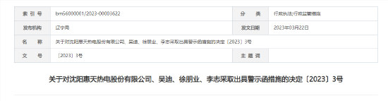 3月20日,辽宁证监局发布《关于对沈阳惠天热电股份有限公司、吴迪、徐朋业、李志采取出具警示函措施的决定〔2023〕3号》。公告显示,沈阳惠天热电未及时披露子公司诉讼情况,公司及相关负责人被出具警示函。