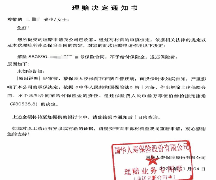 等待数日后,李女士收到了国华人寿的《理赔决定通知书》。其中称:经审核,被保险人投保前存在脑血管疾病,而投保时未如实告知,严重影响了本公司的承保决定,根据《中华人民共和国保险法》第十六条,作出解除上述保险合同,不予承担合同前给付保险金的责任,退还保险费30538.8元的决定。