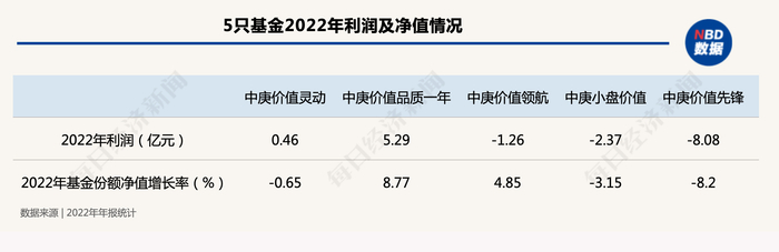 具体看来,中庚价值领航、中庚小盘价值、中庚价值先锋2022年内利润亏损。其中,中庚价值先锋利润亏损最大,年内利润亏损8.08亿元,基金份额净值年内也跌去8.20%。