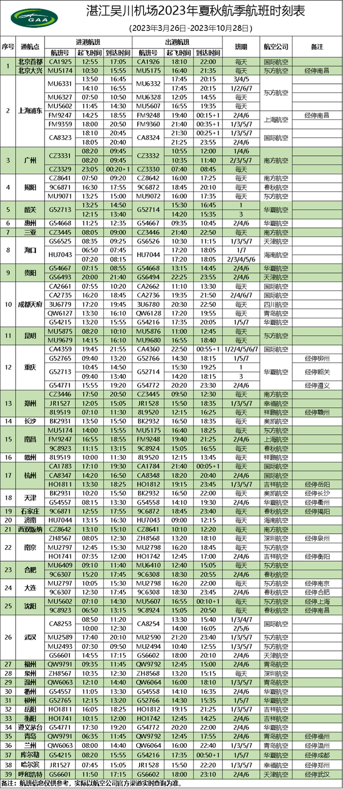湛江吴川机场新航季航线情况