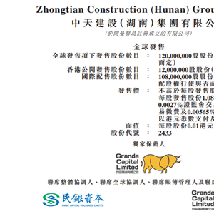 3月20日,中天湖南集团发布全球发售公告,拟全球发售1.2亿股股份,其中香港公开发售1200万股股份,国际配售1.08亿股股份。每股发行价格不高于1.28港元,且预期不低于1.08港元。以最高发行价格计算,中天湖南集团最高募资规模约为1.53亿港元。