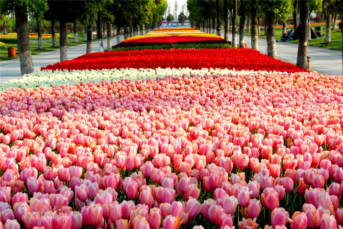 园艺师们以鲜花为笔,在林间小路、清水湖畔、鲜花大道、碧野田间谱写春天的乐章,让你不出国门,即可赏尽纯正的荷兰风情。