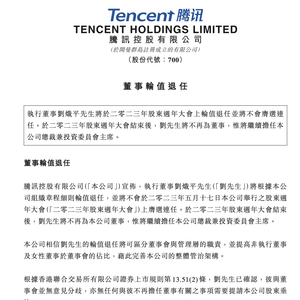 3月22日,腾讯董事会公告,刘炽平将轮值退任执行董事,但管理职责不变,继续担任公司总裁兼投资委员会主席,致力于集团的日常运营和管理。此举是为了更清晰地划分公司董事会及管理团队职责,同时提升董事会中非执行董事和女性董事占比,改善公司治理结构。