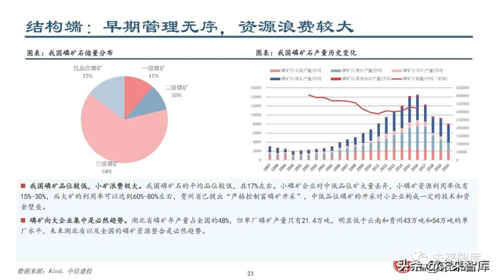 我国磷矿品位较低,小矿浪费极大。我国磷矿石的平均品位较低,在17%左右。小磷矿企业对中低品位矿大量丢弃,小磷矿资源利用率仅有 15%-30%,而大矿的利用率可以达到60%-80%左右,贵州省已提出“严格控制富磷矿开采”,中低品位磷矿的开采对小企业构成一定的技术和资 金壁垒。磷矿向大企业集中是必然趋势。湖北省磷矿年产量占全国的48%,但单厂磷矿产量只有21.4万吨,明显低于云南和贵州43万吨和54万吨的单 厂水平,未来湖北省以及全国的磷矿资源整合是必然趋势。