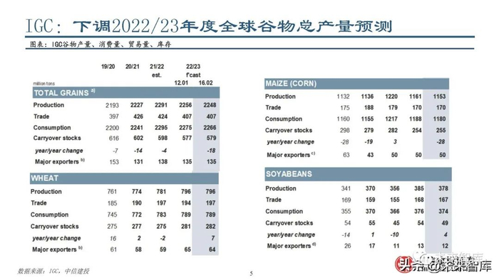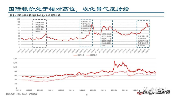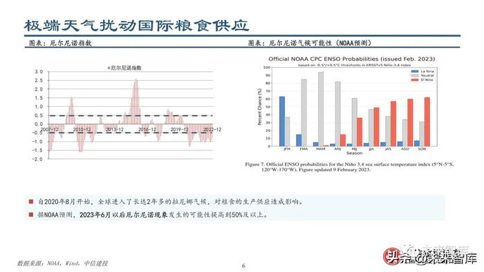 自2020年8月开始,全球进入了长达2年多的拉尼娜气候,对粮食的生产供应造成影响。据NOAA预测,2023年6月以后厄尔尼诺现象发生的可能性提高到50%及以上。