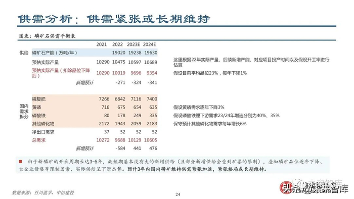 由于新磷矿的开采周期长达3-5年,故短期基本没有大的新增供给(且部分新增供给会受到矿票的限制),叠加磷矿品位逐年下降、 大企业惜售等限制因素,实际供给呈下滑态势。预计3年内国内磷矿维持供需紧张加速,紧张格局或长期维持。