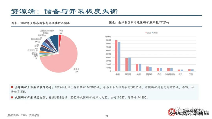 全球磷矿资源集中在摩洛哥。2022年全球已探明磷矿石720亿吨,摩洛哥和西撒哈拉有500亿吨,中国磷矿储量约为19亿吨,占3%,位 居世界第5。我国磷矿开采极度失衡。根据USGS数据,2022年我国磷矿储产比为22,全球为327,摩洛哥为1250。
