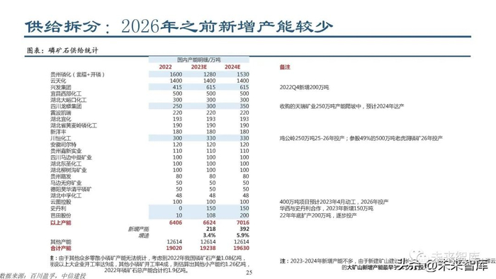 需求端:2015年以来,为解决过度施肥问题,农业农村部推动化肥农药使用量零增长行动,需求有所下降;供应端:2015年工信部发布指导意见,要求化肥行业严控新增产能、加快淘汰落后产能,之后产能下降速度快于需求;2022年2月,发改委《磷铵行业节能降碳改造升级指南》提出,到2025年,磷铵行业能效标杆水平以上产能比例达到 30%,能效基准水平以下产 能低于30%;2022年4月工信部、发改委等六部门发布《“十四五”石化化工指导意见》,指出要严控磷铵、黄磷等产品新增产能;预计十四五期间磷肥延续产能出清趋势,行业向头部集中。