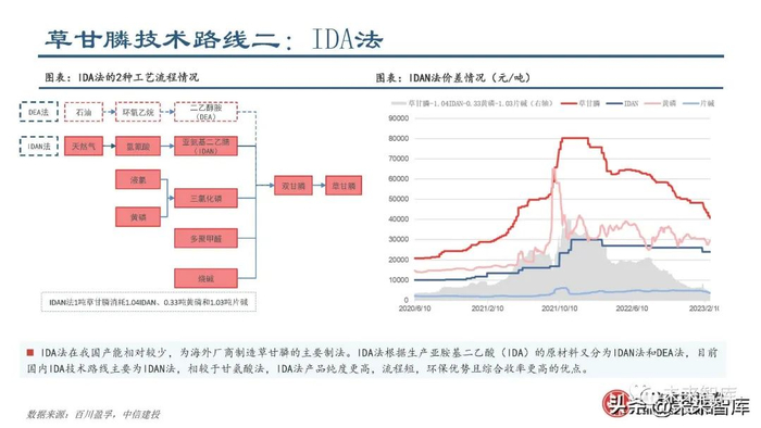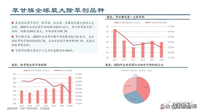 在全球农药市场中,除草剂、杀虫剂、杀菌剂为最主要的三大 品种,2020年全球农药市场规模为607亿美元,其中除草剂为第一 品种,规模为244亿美元,市场份额为40.2%。草甘膦方面,2020年全球草甘膦市场规模为56.0亿美元,占全 球除草剂市场规模的23.3%,占全球农药市场规模的9.3%,是最大 的除草剂品种。目前草甘膦主要生产工艺为甘氨酸法和IDA法。