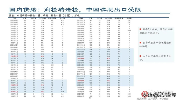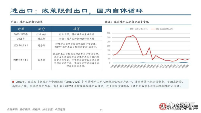 2016年,我国在《全国矿产资源规划(2016-2020)》中将磷矿石列入24种战略性矿产之一,并启动第一轮环保督查,整治高污染、 高能耗产能,实施供给侧改革。商务部自2009年来持续监控磷矿石出口,设置出口量指标和出口企业名录来规范和限制磷矿石出口。