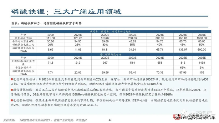 电动车电池领域:到2025年新能源汽车销量达到新车销量的20%左右,保守估计新车市场规模在3000万辆,纯电动汽车市场规模将达到约450 万辆。假设磷酸铁锂在动力电池市场中的份额达到45%,预测2025年磷酸铁锂动力电池装机量将在133GWh左右 。通信储能领域:我国正在从采用铅酸蓄电池电池的4G基站向5G基站进化,来中国至少需要新建或改造1438万个基站,以单站能耗2700W、应 急4h进行估算,5G基站储能市场未来将提供155GWh的磷酸铁锂电池需求空间,预测2025年磷酸铁锂需求量约为88GWh;电动船舶领域:假设未来每年民用船舶总数平均下降4.9%,单位船舶吨位平均净重0.178万吨/艘,内湖船舶总吨位占比民用机动船舶总吨位 的92%,预测2025年电动船舶用磷酸铁锂需求量达到90Gwh以上。