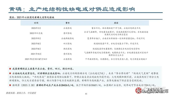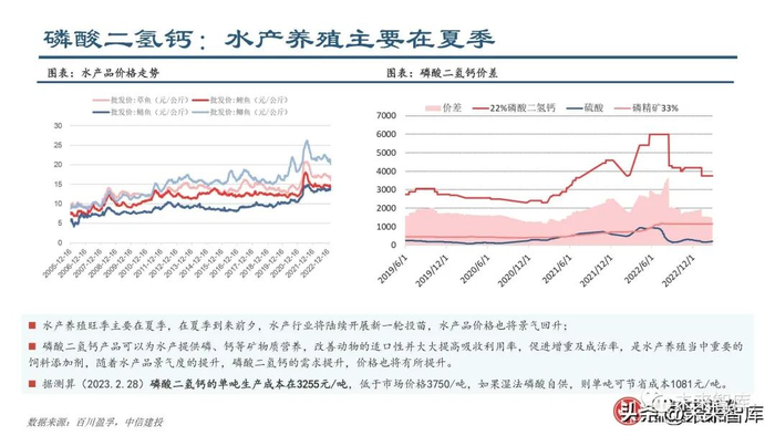 水产养殖旺季主要在夏季,在夏季到来前夕,水产行业将陆续开展新一轮投苗,水产品价格也将景气回升;磷酸二氢钙产品可以为水产提供磷、钙等矿物质营养,改善动物的适口性并大大提高吸收利用率,促进增重及成活率,是水产养殖当中重要的 饲料添加剂,随着水产品景气度的提升,磷酸二氢钙的需求提升,价格也将有所提升。据测算(2023.2.28)磷酸二氢钙的单吨生产成本在3255元/吨,低于市场价格3750/吨,如果湿法磷酸自供,则单吨可节省成本1081元/吨。