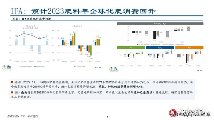 根据(2022.11)IFA国际肥料协会预测,全球化肥消费量在2021和2022肥料年分别下降2%和5%之后,预计2023肥料年将回升3%,消 费恢复到略高于2019肥料年的水平,预计氮肥消费量将增长2%,磷肥、钾肥的消费量分别增长4%。预计南美将引领2023肥料年化肥的消费复苏,尤其是磷肥和钾肥;而南亚(主要包括印度和巴基斯坦)将是氮肥、磷肥消费复苏的 第二大贡献者。