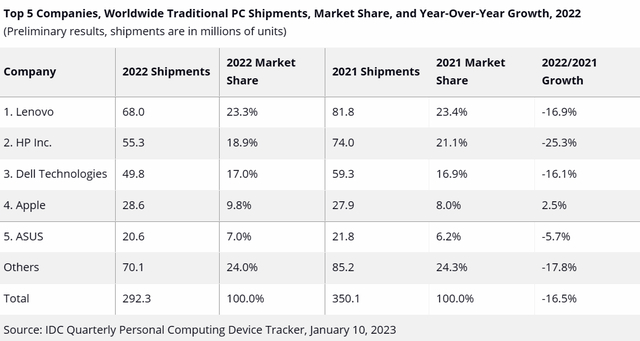IDC数据显示,尽管联想依然是2022年全球PC出货量第一的品牌,但同比2021年却下滑了16.9%。