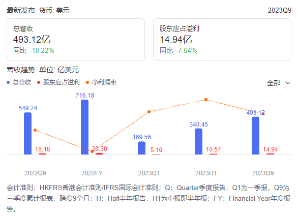 2022-2023财年前三季度,联想营收为493亿美元,同比下降10%。第三季度的表现更差,营收为153亿美元,同比下降24%,近利润也比去年同期也大幅下跌32%。