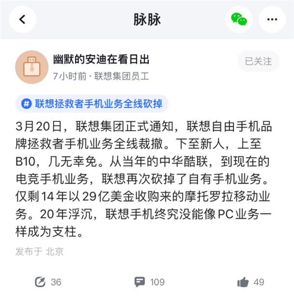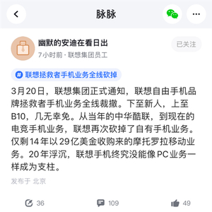 一位脉脉平台认证为联想员工的人发文称,联想集团已经发出正式通知,自有手机品牌拯救者手机业务全线裁撤。下至新人,上至B10,几无幸免。
