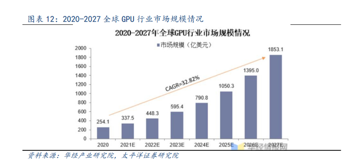 太平洋证券研报表示,根据华经产业研究院发布的《2021-2026年中国GPU行业发展监测及投资战略规划研究报告》,2020年全球GPU行业市场规模达254.1亿美元,预计2027年将达到1853.1亿美元,复合年均增长率32.82%,GPU市场保持高速增长态势。